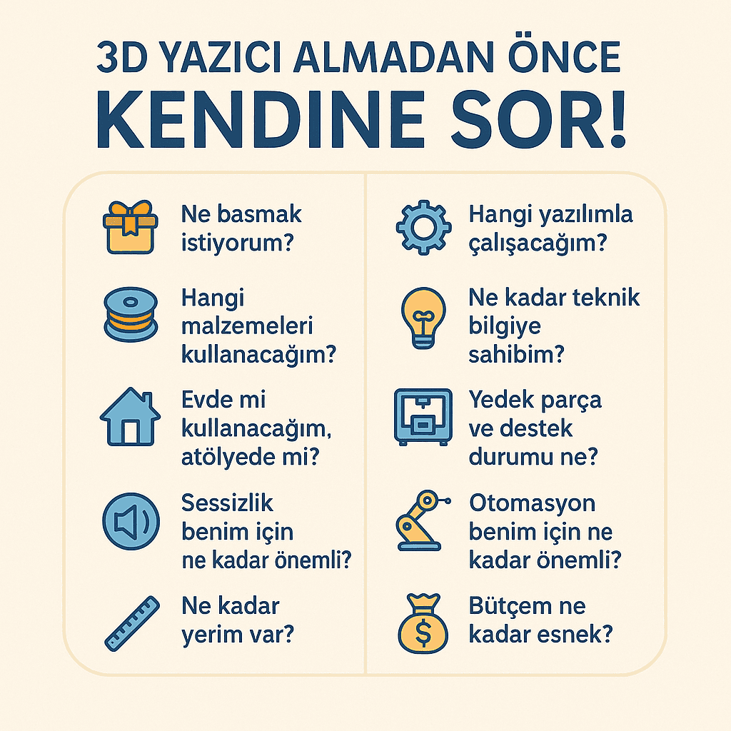 3D yazıcı seçmek, ayakkabı almak gibi değildir. Ayağına göre değil, kafandaki projelere göre model seçmen gerekir. Bu sorular seni tanımlar, seni tanıyan biri de ne alacağını bilir.